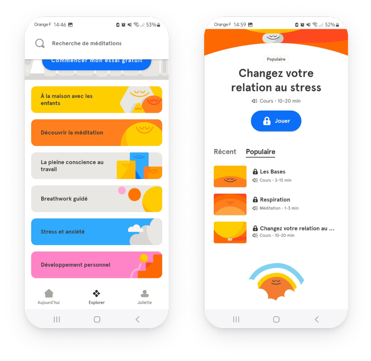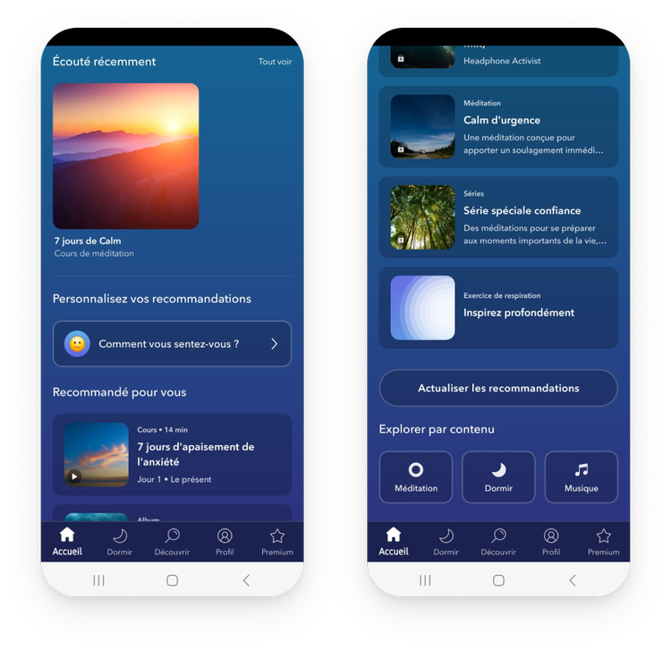Un accueil personnalisé avec des recommandations dans chaque catégorie (cours, méditation, respiration, etc.), ajustées selon l’humeur via un bilan d’auto-évaluation.