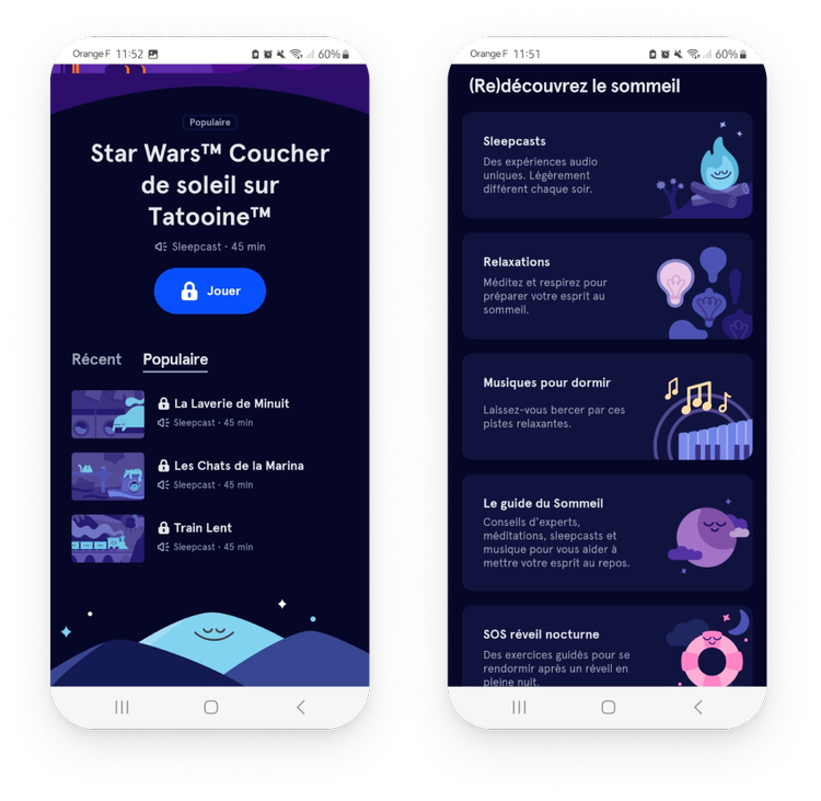 Une section sommeil riche et variée, offrant un large choix de contenus pour accompagner l’endormissement. Son interface aux teintes sombres est spécialement conçue pour reposer les yeux et améliorer l’expérience nocturne.